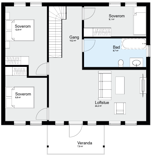 I dette flotte huset får du to romslige bad, eget vaskerom, hele fire store soverom, egen loftstue, og en stor og åpen stue- og kjøkkenløsning. I dette hjemmet kan mye skje på en gang, og hele familien har plass å boltre seg på, samtidig som du får et herskapshus i en praktisk og overkommelig størrelse.